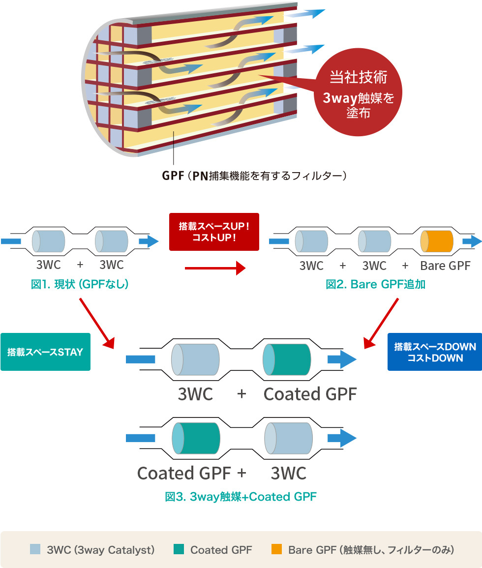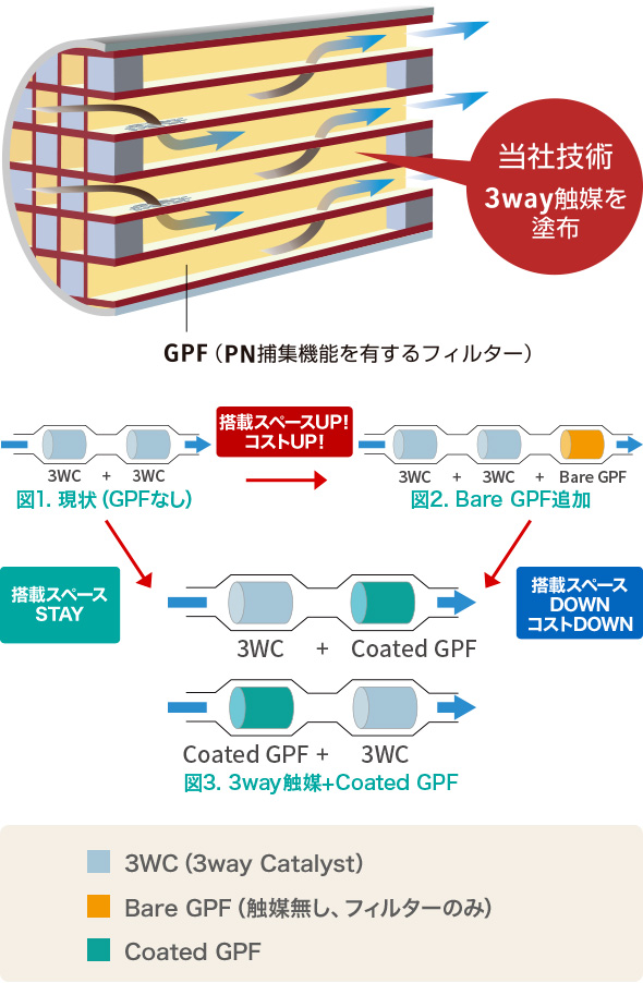 PN(排出微粒子の粒子数)規制は、PM(粒子状物質)の質量規制と異なり、微小なPMの排出個数を抑えなければなりません。そこで期待されるのがPN捕集機能を有するフィルター『ガソリン・パティキュレート・フィルター(GPF)』です。但し、GPF を単純に追加すると、搭載スペースやコストがその分だけ増えてしまいます。(図2:Bare GPF追加)そこで、当社が開発を進めているのが、GPFに3way触媒の浄化機能を付与した『Coated GPF』です。