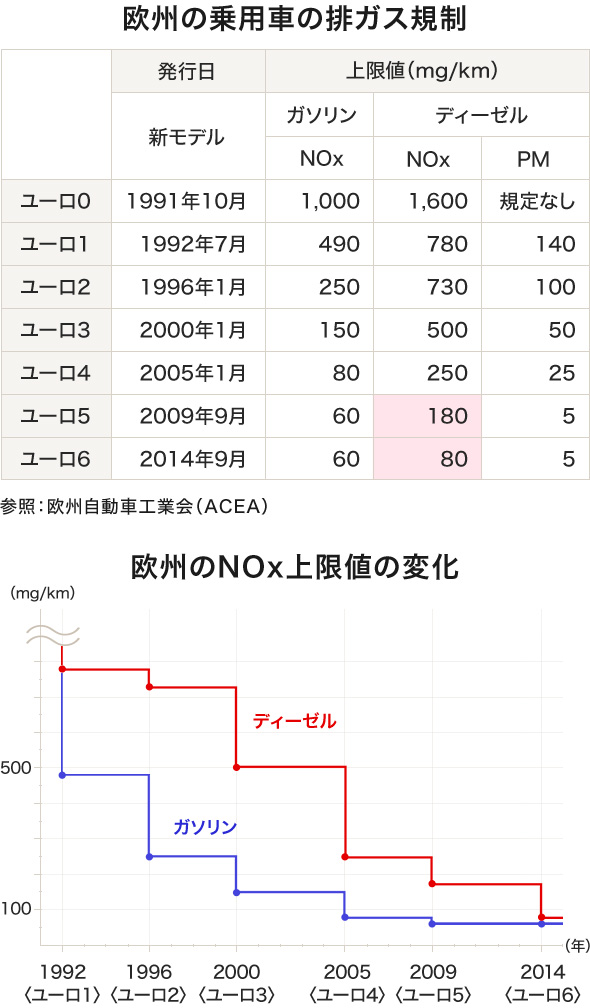 2014年4月、ロンドンに『白いスモッグ』が覆い、英国の環境・食糧・農村地域省は、一部の地域に大気汚染最高レベル『非常に高い』と警告をし、パリでは、政府が『大気汚染警報』を発令しました。これらの原因のひとつは、2000年代に燃費の良いディーゼルエンジン車の人気が高まったこと。新規登録台数に占めるディーゼル車の割合は5割を越え、フランスでは6割を越えています。しかし、欧州ではガソリン車に比べディーゼル車の排ガス規制は遅れていました。欧州では、70年代から環境規制がはじまって以降、順次厳しい基準を制定してきたが、大気汚染は想定したほど改善されず、さらなる規制強化策として2014年9月に排出ガス規制『ユーロ6』が発行されました。