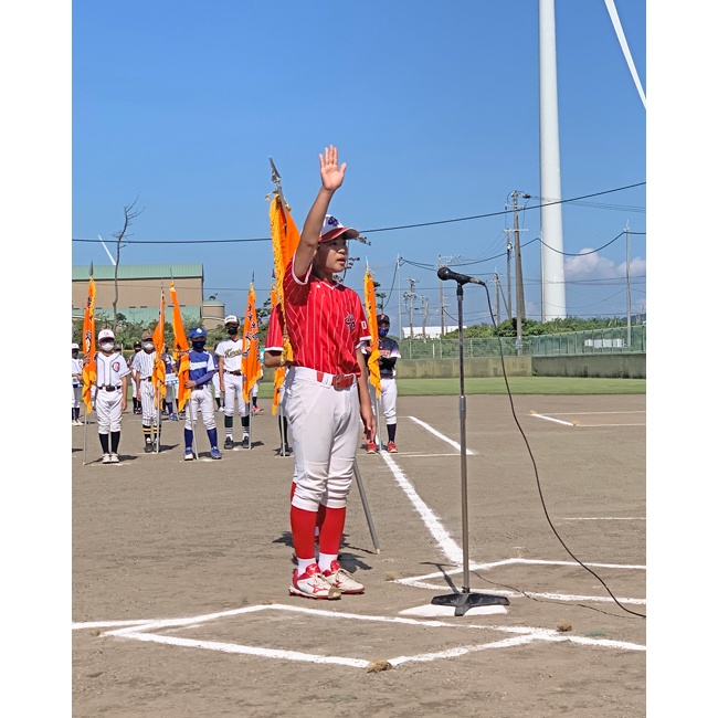 開会式は、掛川市大東総合運動場で開催され、選手宣誓をした佐束土方野球スポーツ少年団の藤田選手(大東支部)は「2年間出場できなかった先輩や、今日来られない選手の分まで大好きな野球を精いっぱい楽しみ、全力でプレーする」と力強く述べてくれました。