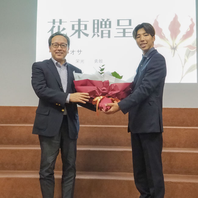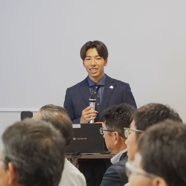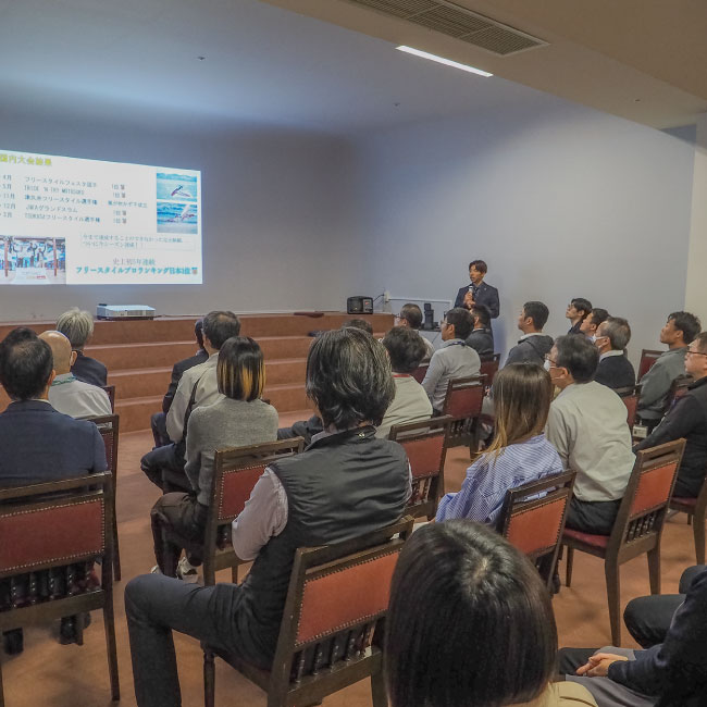 2025年度は国内大会すべてで優勝し、史上初の5季連続シーズンチャンピオンとなり、また、海外大会でも日本人初の好成績を収めました。ほかにも、海外ツアー会場の盛り上がりやツアー中に起こったハプニングエピソードなどを、守屋選手お手製のプレゼンテーションや動画で説明されました。参加者は終始興味深く聞き入っていました。