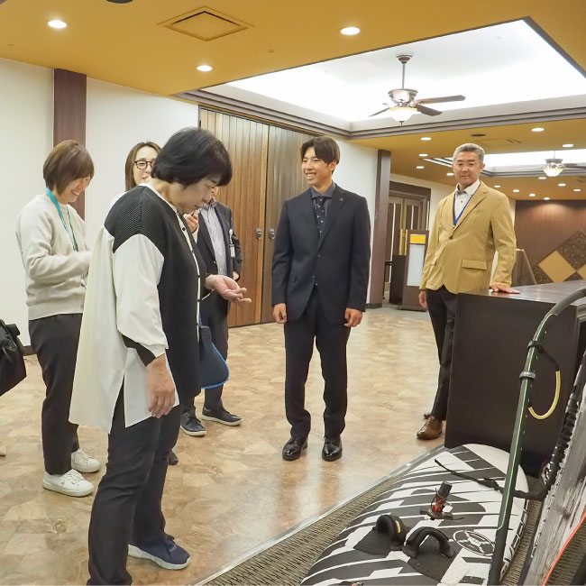 会場には守屋選手が実際に使用されていたサーフボードやセイルなどの展示もあり、会終了後は多くの従業員が守屋選手に直接質問をするなどコミュニケーションも深まる良い機会となりました。