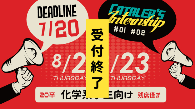 2018年8月2日(木)、23日(木)に開催されます2020新卒向け インターンシップ (化学系学生対象) の応募受付を7/20(金)で締め切りました。第3回目は9/13(木)となります。定員の10名まで、数名分の残席がございます。こちらの〆切は8月31日(金)応募分までとさせていただきます。学生のみなさまの多数のご応募をお待ちしております。