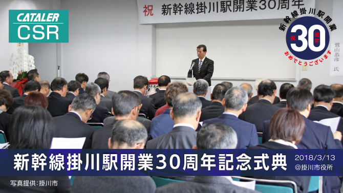 東海道新幹線掛川駅は3月13日で開業30周年を迎え、掛川市役所で「新幹線掛川駅開業30周年記念式典」が開催されました。記念式典には、掛川市職員をはじめ、掛川市民、地元企業の皆さまなどが参加しました。開業時に駅南土地区画整理組合が、駅南口広場のモニュメント「合体」の中に納めたタイムカプセルの開封・披露のイベントや、掛川駅木造駅舎の保存・活用の講演なども行われ、大変すばらしい式典となりました。